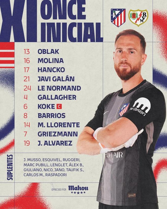 馬德里競(jìng)技首發(fā):13-奧布拉克、16-莫利納、24-勒諾爾芒、17-漢茨科、21-哈維-加蘭、14-馬科斯-略倫特、6-科克、8-巴勃羅-巴里奧斯、4-加拉格爾、19-阿爾瓦雷斯、7-格列茲曼