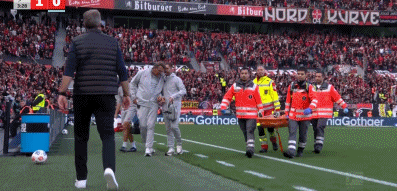 第45+1分鐘,格里馬爾多被打到面部后血染賽場,隨后被擔(dān)架抬出場