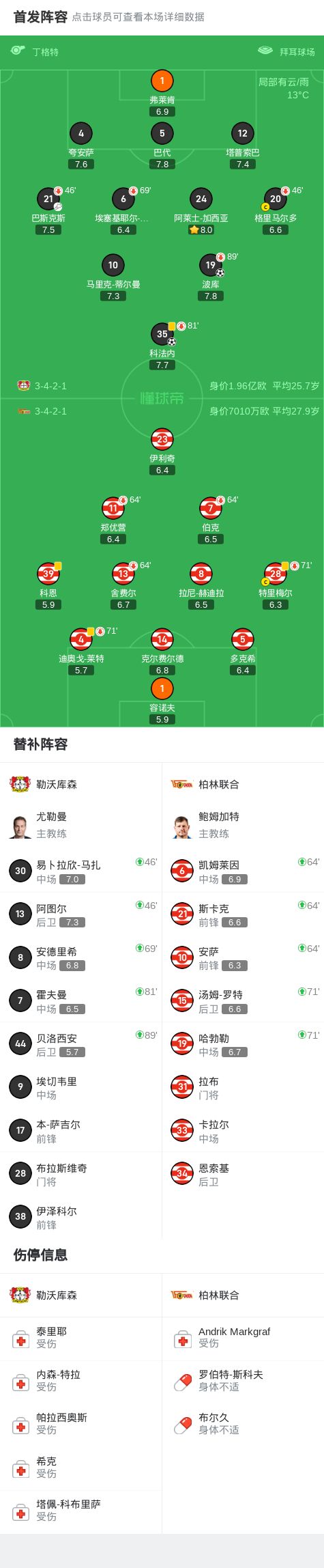 勒沃庫森2-0柏林聯(lián)合,波庫、科法內(nèi)破門,容諾夫送大禮