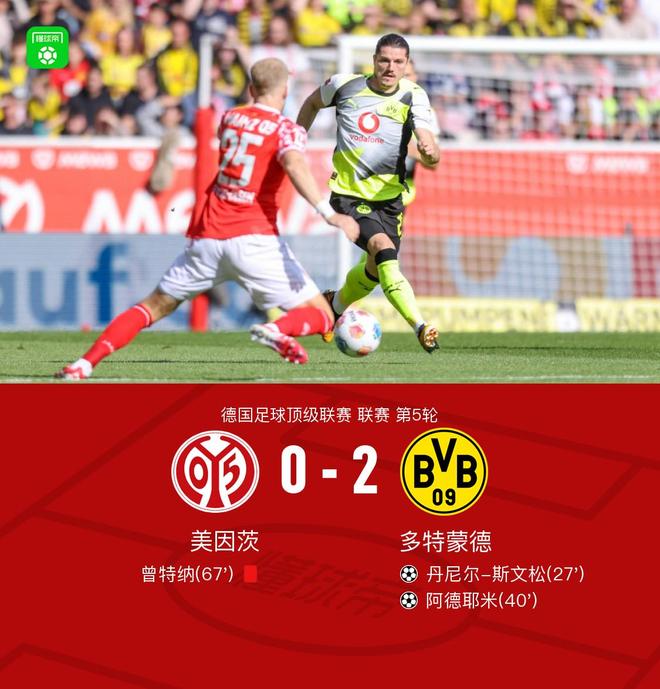 多特2-0客勝美因茨,阿德耶米破門+造紅牌,布蘭特兩助攻